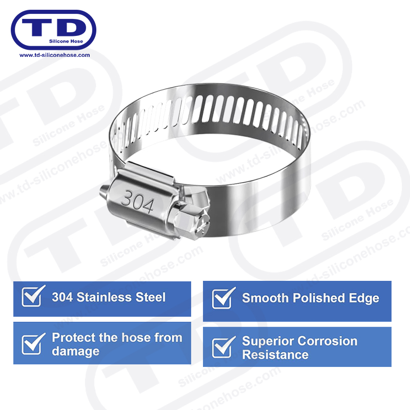 1.Material Compatibility: Ang materyal ng silicone hose clamp ay kailangang maging katugma sa silicone hose upang maiwasan ang pinsala sa medyas dahil sa mga reaksyon ng kemikal o kaagnasan. Tinitiyak ng pagiging tugma na ang hose clamp ay hindi nagiging sanhi ng pinsala sa medyas, sa gayon ay pinalawak ang buhay ng serbisyo ng medyas.
